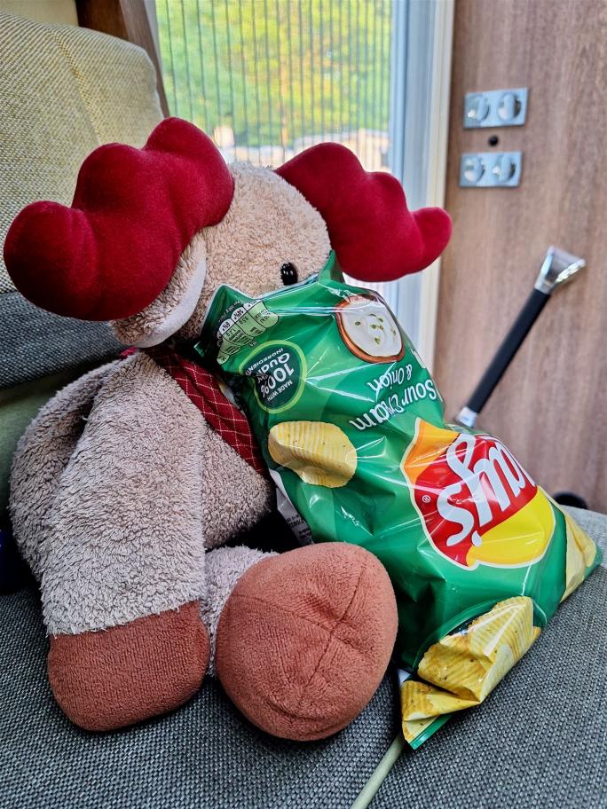Irgendwann im Laufe des Abend ziehen wir uns ins Wohnmobil zurück. Es ist Samstag, da besteht Elli (der Elch) auf seine Ration Chips. Da wir ihn nicht schon zu Beginn der Reise verärgern möchten, übergeben wir ihm die geöffnete Tüte Chips. Wir machen sie lieber selber auf, wenn er es macht ... das nimmt kein gutes Ende.