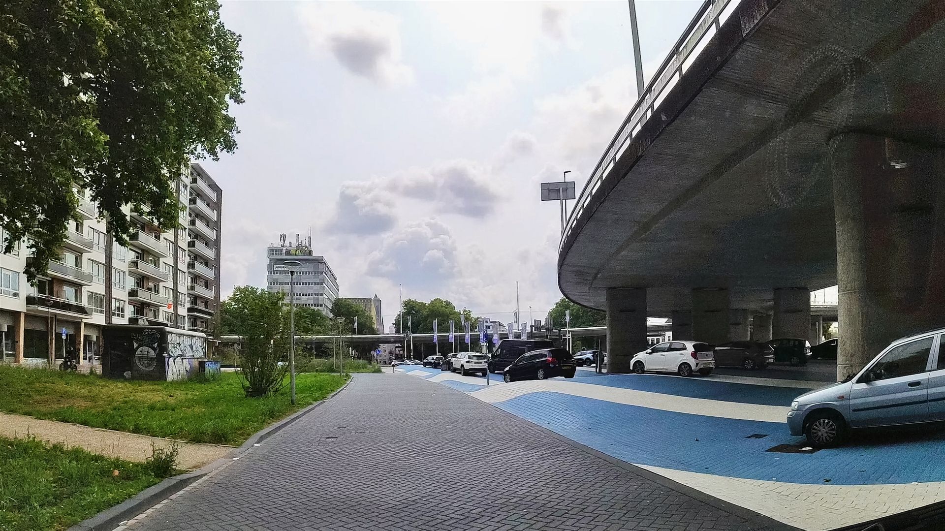 Der zweite Parkplatz ist in Wellenform angelegt (siehe Bild). Die Höhe unter der Brücke könnte passen, aber das Risiko des Aufsetzens beim überfahren einer Welle wollen wir nicht riskieren. Also streichen wir diesen Punkt von der Liste und fahren weiter.