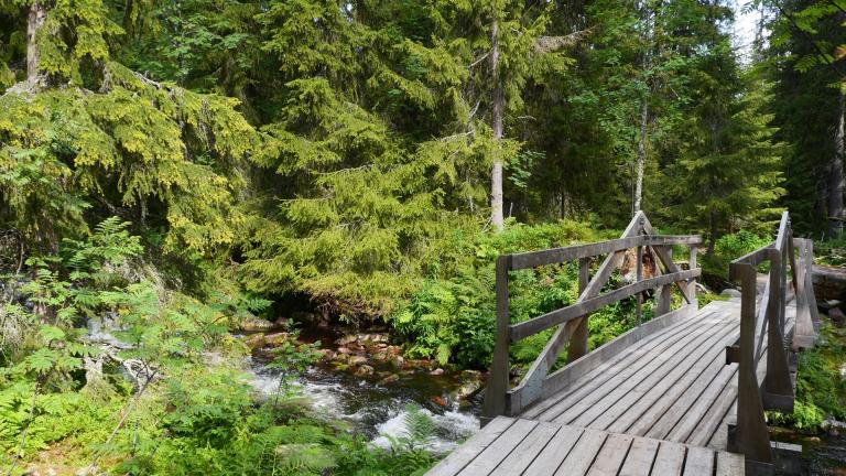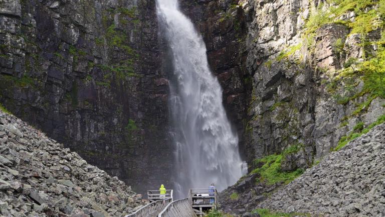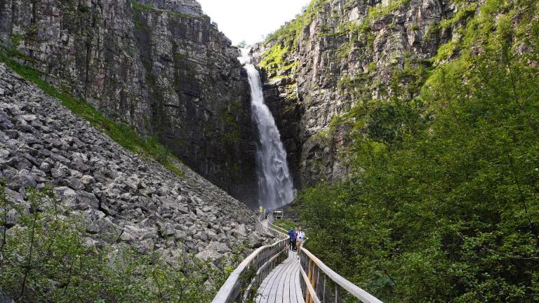 Dann weiter bis zum Parkplatz des Nationalparkes. Unser Ziel ist der größte Wasserfall Schwedens mit 125m Höhe und eine Fallhöhe von 90m. Der Rundwanderweg führt uns relativ bequem dort hin. Allerdings sollte man trittfest sein und ein wenig schwindelfrei.