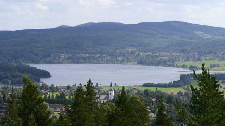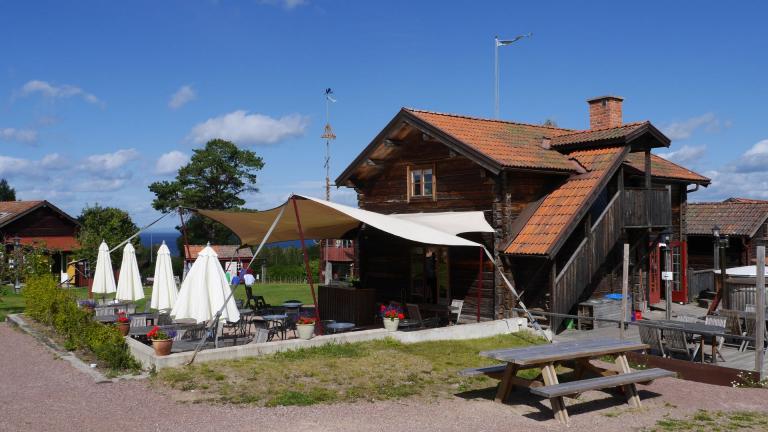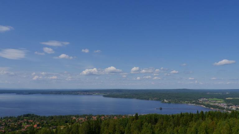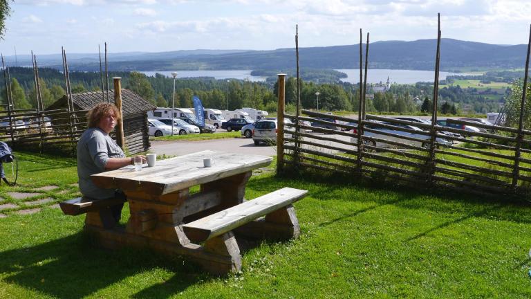Draußen sitzend genießen wir die Sonne und den wunderschönen Blick zum Ort hinunter und auf den Siljan See. Auch so vergeht die Zeit, so dass wir beihnahe das eigentliche Ziel vergessen: den Aussichtsturm vom Naturum Dalarna .