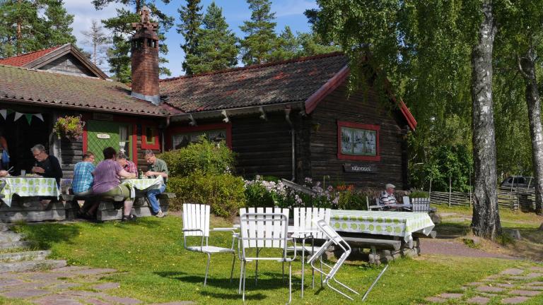 Einen Kaffee zur Stärkung bevor wir wieder losfahren wir wollen eigentlich an den schönen Stellplatz am kleinen Yachthafen am See aber dort ist schon alles belegt (leider auch durch PKW's). So drehen wir ab und fahren noch eine Runde durch den malerischen Ort mit den vielen alten Häusern, bevor wir weiter in das Städtchen Rättvik fahren.