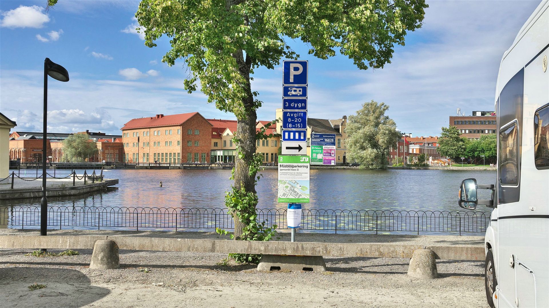 Und so erreichen wir knapp eine Stunde später die Stadt "Eskilstuna" und finden den dortigen "Stellplatz" (Link) vor, direkt am Wasser liegend und praktisch im Zentrum für 100 SEK die Nacht.