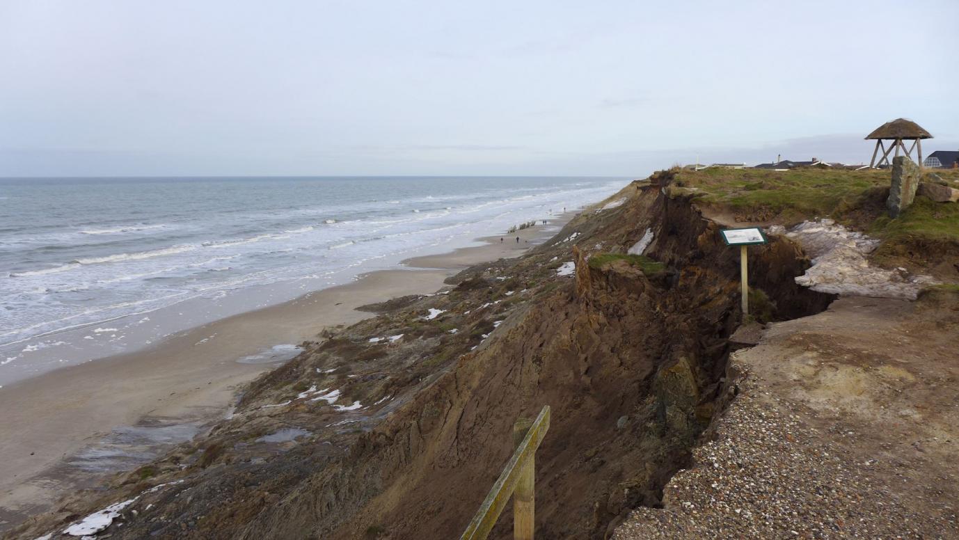 Über die Aggersund-Brücke hinweg halten wir uns dann auf der Straße 11 gen Osten bis Aabybro. In der uns schon gut bekannten Mejeri halten wir wieder für einen kleinen Einkauf. Dann geht es in nördlicher Richtung weiter. Vorbei an Blokhus und Løkken kommen wir nach Nr. Lyngby. Dieser Ort ist vor allem wegen seiner Steilküste bekannt, die hier Jahr für Jahr mehr ins Meer gerissen wird. Nach und nach werden dabei auch Häuser in die Tiefe gerissen. Wir spazieren hier auch am Strand entlang, wohl wissend, dass es hier immer wieder Erd- nein: Sand-Rutsche gibt. Da der Sand aber stark gefroren ist, hält sich das Risiko in Grenzen.