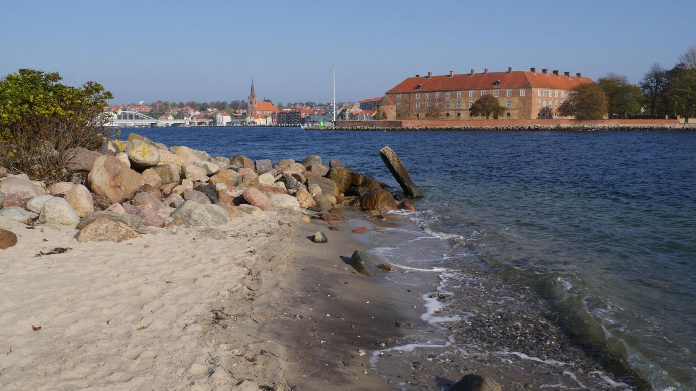 Nach dem ausgiebigen Spaziergang durch die Außenanlagen des Centers gehen wir zum Wohnmobil zurück und fahren eine Nebenstrecke in die nur einen Steinwurf entfernt liegende Stadt Sønderborg. Spaziergang zuerst entlang der Sønderburg Bucht, mit einem schönen Blick auf das gegenüber liegende Schloß und die Stadt selbst.