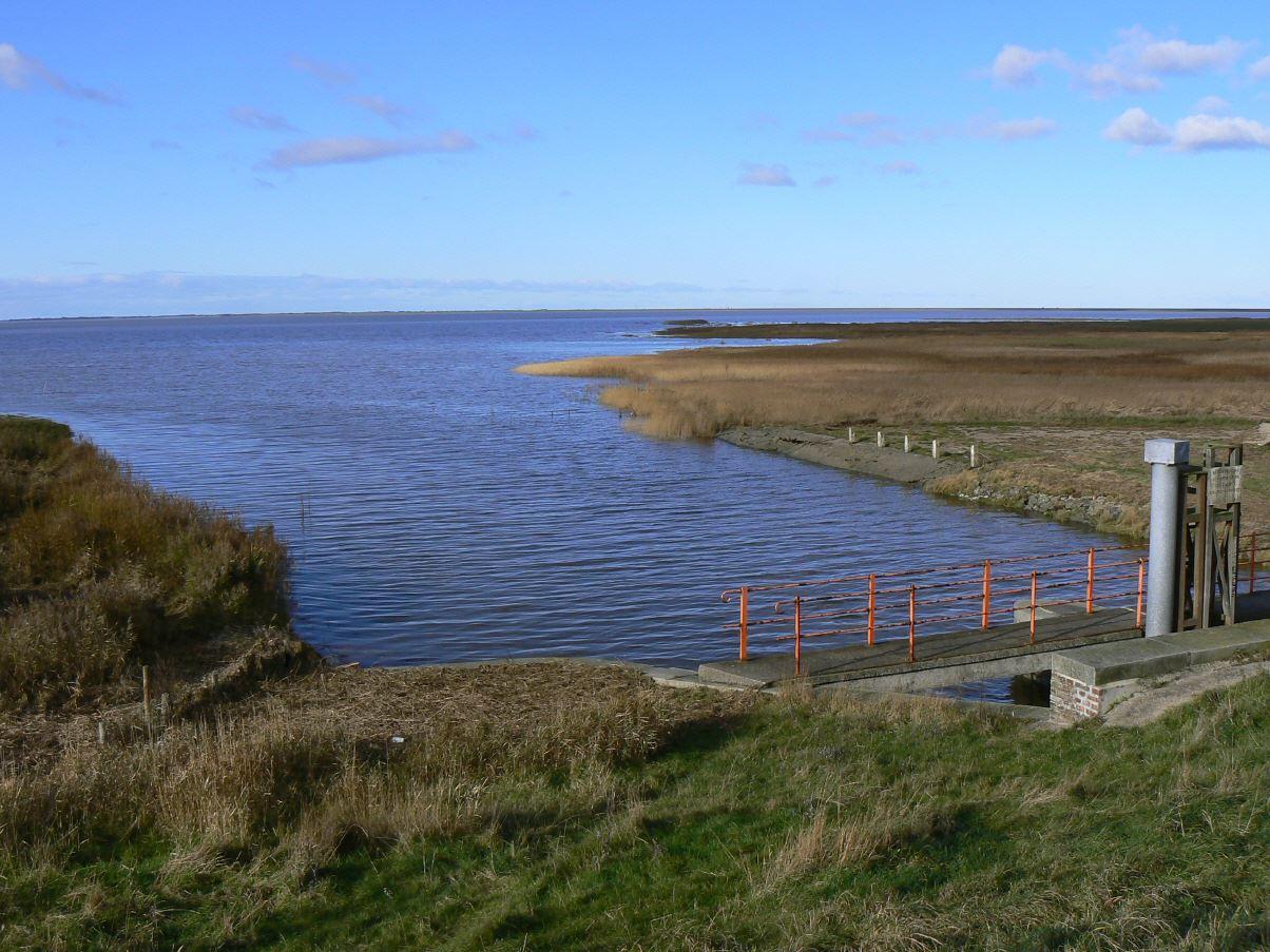Dann verlassen wir gegen Mittag die Insel. Auf dem Weg nach Tønder ein kurzer Stop an der Ballum Sluse, eine alte Schleuse am Deich ... und noch ein Stop bei Hjerpsted, hier kurzer Strandbummel mit letztem Blick über das Meer zur Insel Rømø. Mona sammelt hier noch ein paar Steine.
