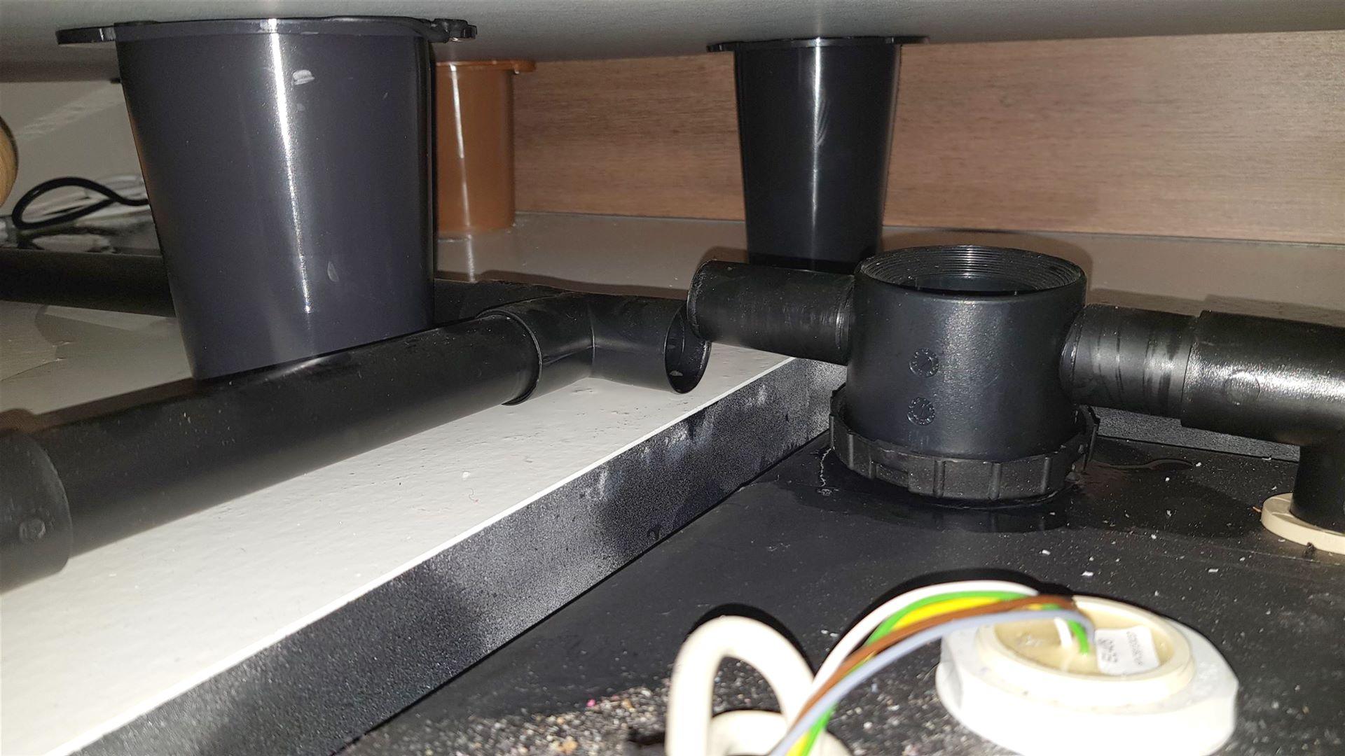 Nach einiger Zeit ist die Ursache auch schnell gefunden ... Die Abwasserrohre der Dusche haben keine Verbindung (mehr) zum Siphon, der direkt vor dem Abwassertank sitzt (siehe Bild). Die Verbindung war vermutlich werkseitig nicht ordentlich aufgesteckt und hat sich gelöst. Kleine Ursache - große Auswirkung !