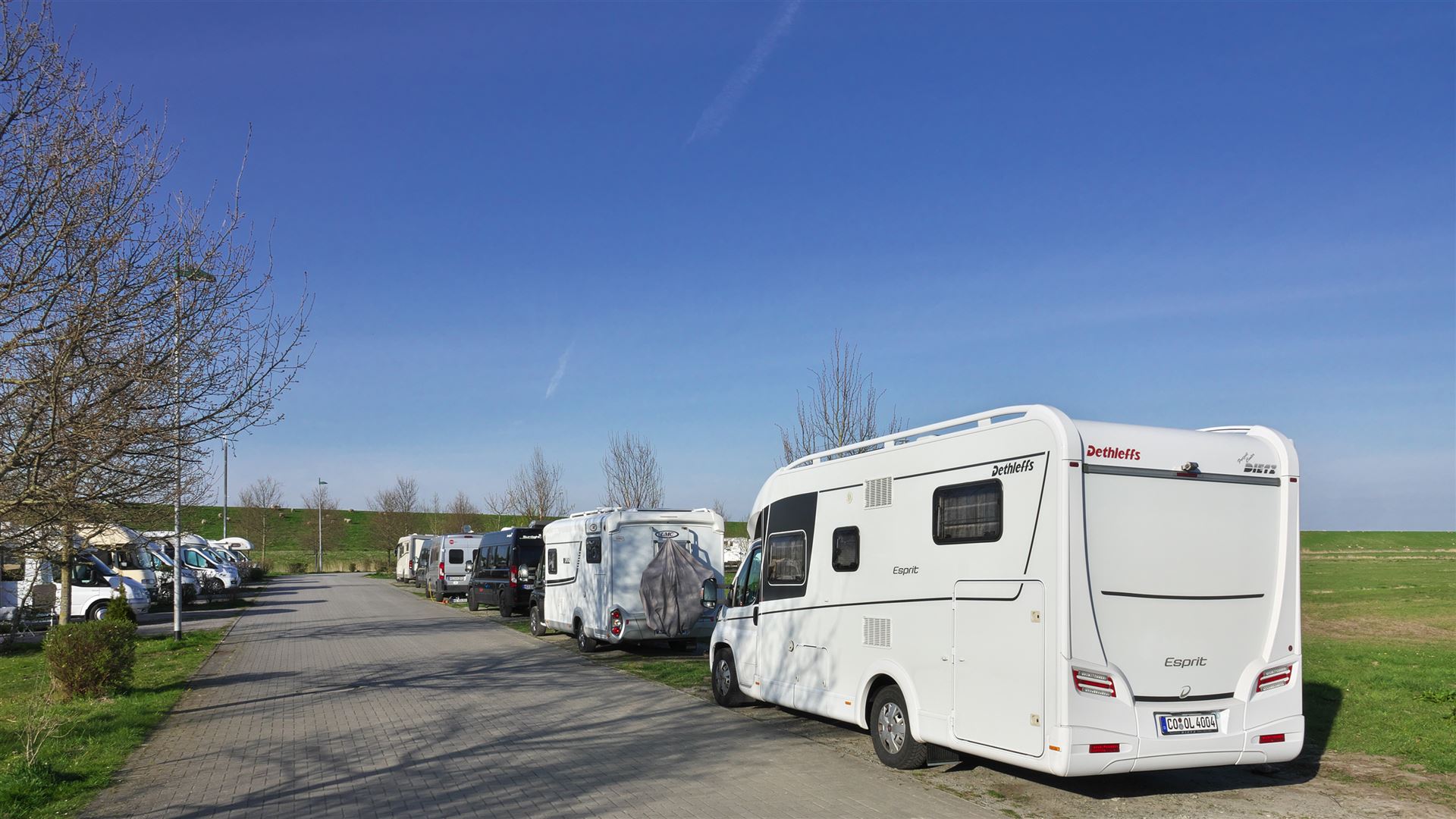 Aus den Niederlanden gerade über die Grenze gekommen ist unser Ziel für heute der beschauliche Fischerort Ditzum an der Ems. Da wir noch vormittags den Stellplatz am Deich von Ditzum erreichen, haben wir Glück mit einem freien Platz !