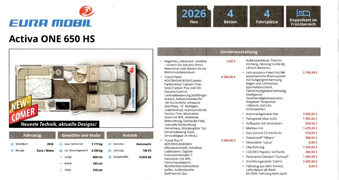 - Eura Mobil "Activa One 650 HS" (Link), ein Alkovenfahrzeug mit einem völlig anderen Grundriss