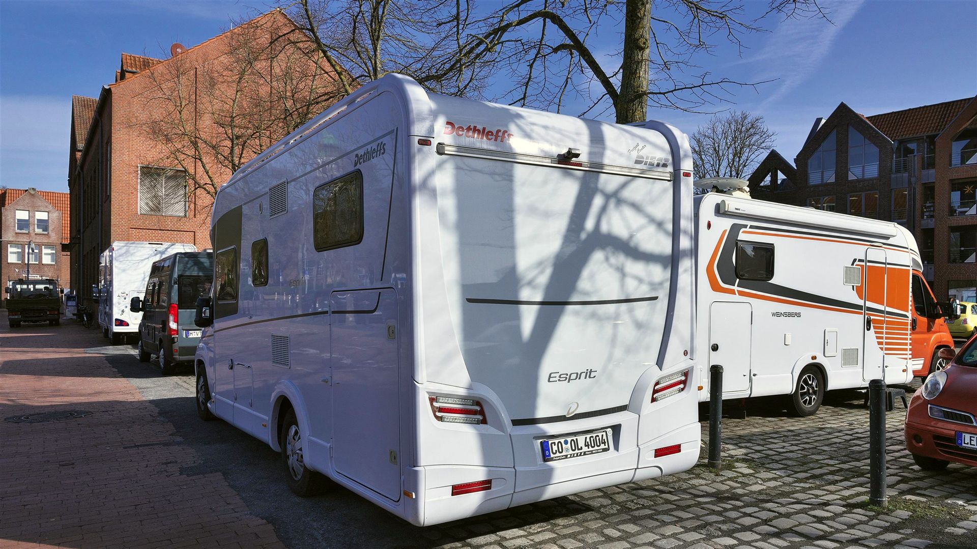 Aber heute haben wir das Glück, dass wir am Wohnmobilstellplatz am "Stellplatz P9 - Große Bleiche" (Link) einen freien Bereich für uns vorfinden. So stehen wir hier mal ausnahmsweise 100% korrekt. In der Vergangenheit mussten wir uns im Parkplatzbereich für PKWs eine geeignete Stelle suchen.
