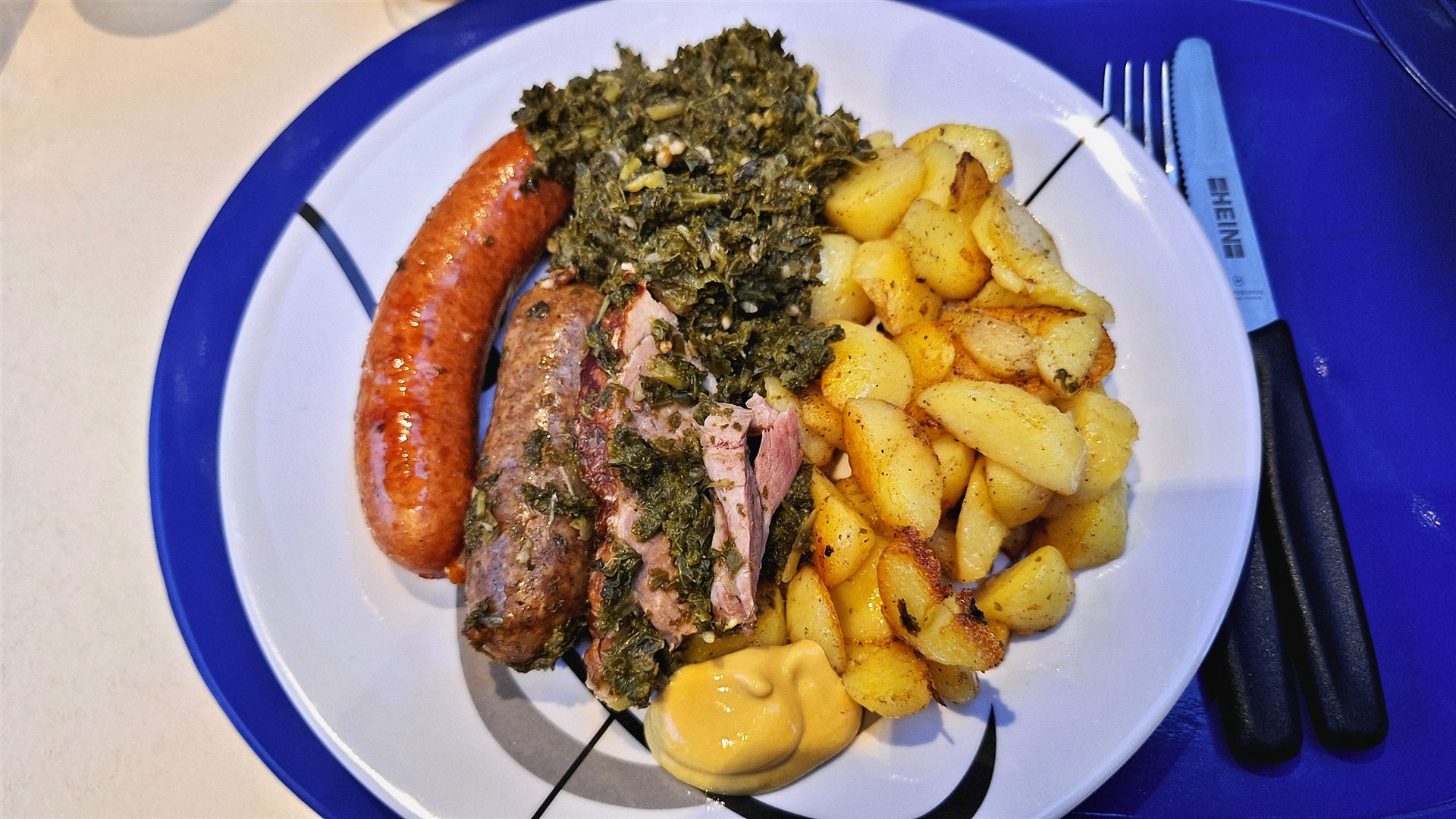 Zum Abendessen gibt es heute den gestern Nachmittag in Bruchhausen-Vilsen gekauften "Grünkohl mit Bratkartoffeln sowie Pinkel, Kasseler und Grützwurst". Das nennen wir mal ein ordentliches Tourende mit richtig leckerem Essen. Aber: die Grützwurst war schon etwas gewöhnungsbedürftig ... für unseren Geschmack zumindest. Der Rest war absolut lecker !