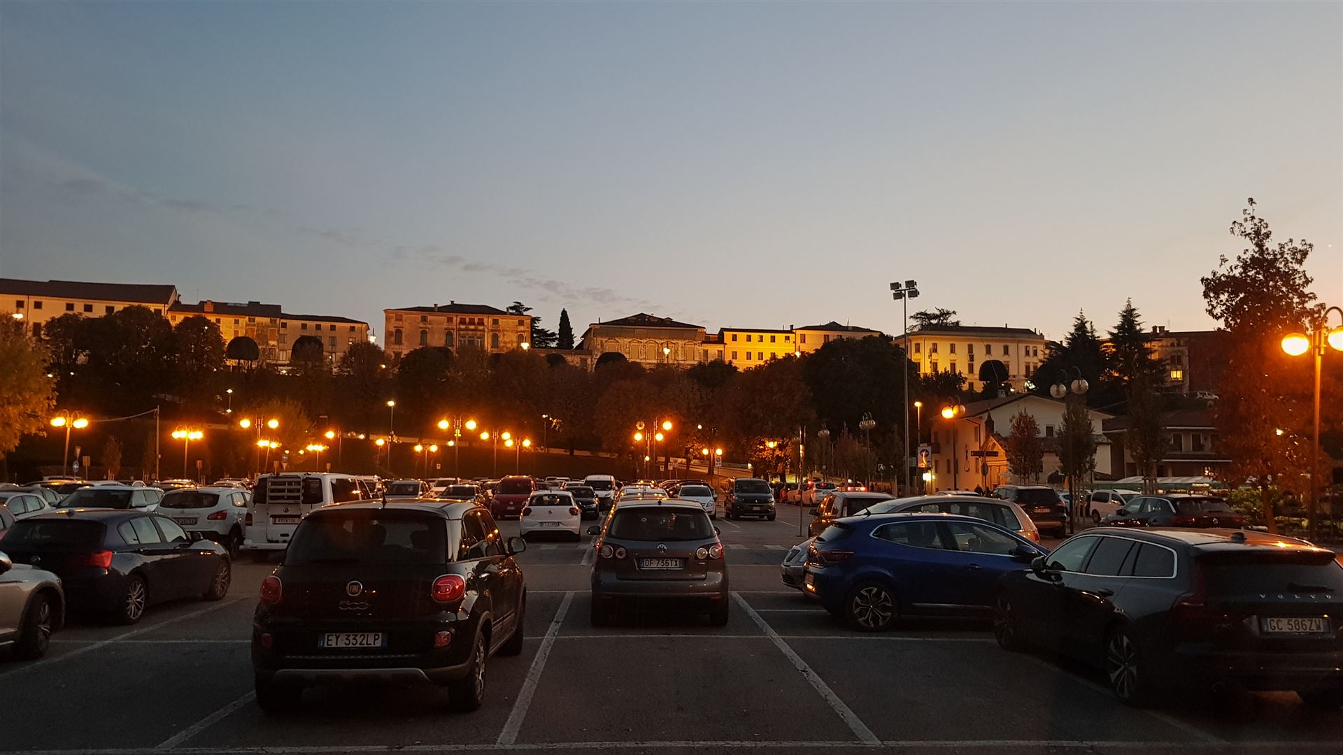 In Bassano lassen wir uns auf dem stadtnahen Parkplatz nieder (wenigstens das klappt heute) und schauen uns nun in Ruhe den kompletten Schaden an. Die grünen Schaber an der Markise sind dabei das kleinste Problem.