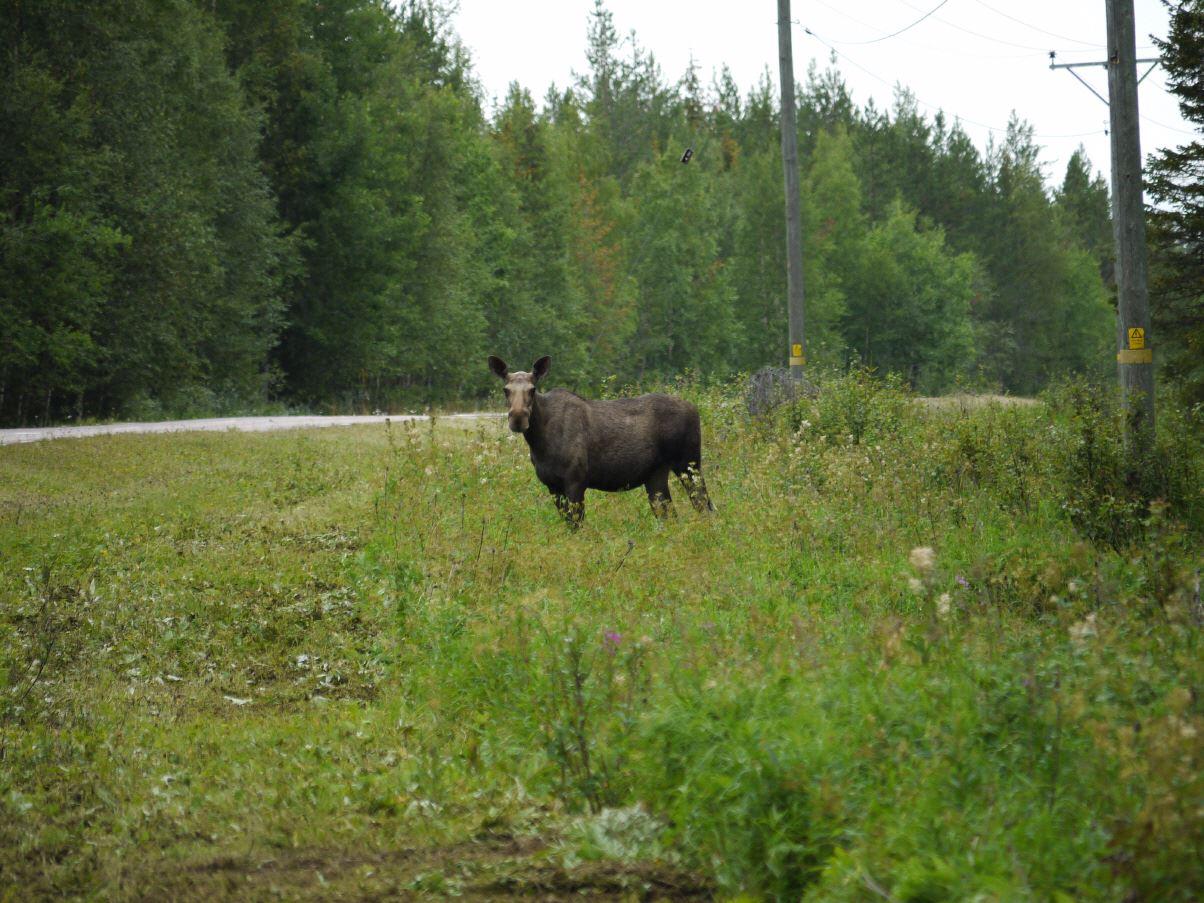 So fahren wir weiter auf der Straße 395. Entgegenkommende Autos geben uns Lichthupe warum wohl ??? Wenig später wissen wir es: eine Elchkuh steht am Straßenrand !!! Es gelingt uns, von der grazilen Dame ein paar Fotos zu machen (zur Beweissicherung):