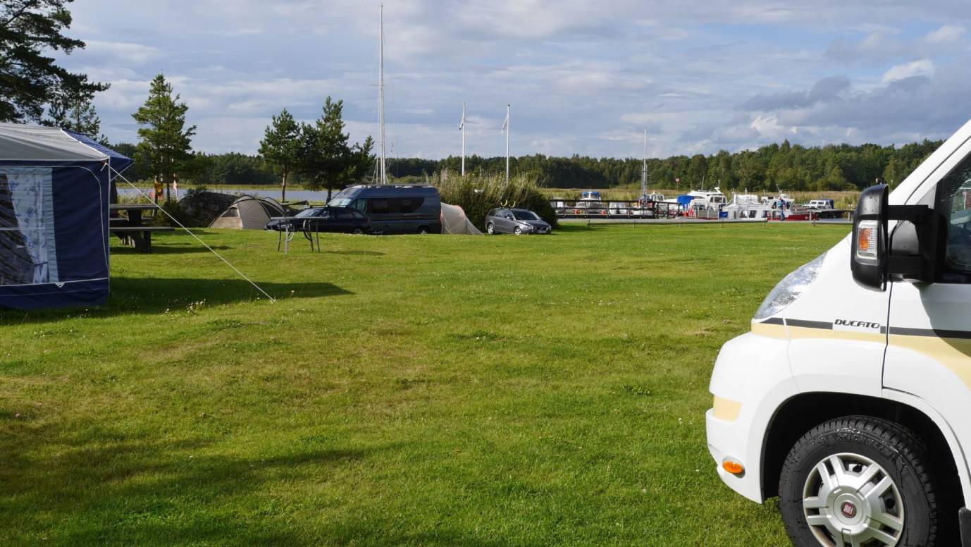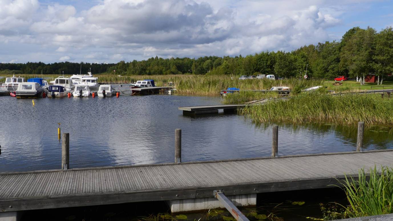 Während wir auf der überdachten Terrasse unser Mahl genießen, kommt wieder ein kräftiger Regenschauer. Trotzdem fühlen wir uns in dem Eck hier wohl und beschließen die Nutzung des Campingplatzes. Für 150 SEK (ca. 16 Euro) können wir hier die Nacht verbringen. Wir fahren auch sogleich auf den Platz und genießen draußen die mal gerade scheinende Sonne mit Blick auf den kleinen Yachthafen am Vänern See.