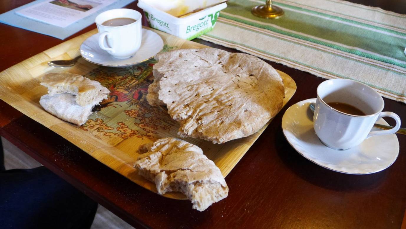 Später dann sind die ersten Brote fertig. Wir lassen uns auf einen Kaffee nieder uns bekommen das frische Brot mit guter Butter zum Probieren vorgesetzt. Es ist wirklich lecker, deswegen kaufen wir auch zwei Stück davon. Wir verweilen noch ein bißchen und unterhalten uns mit dem Ehepaar recht gut.