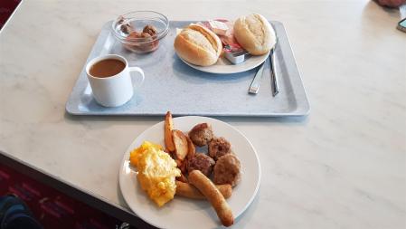 Der Fahrer ist heute sehr pünktlich, so kommen wir auch schnell zum Fährhafen und können einchecken. Das Frühstücksbuffet ist so wie immer ... irgendwo zwischen lauwarm und kalt.