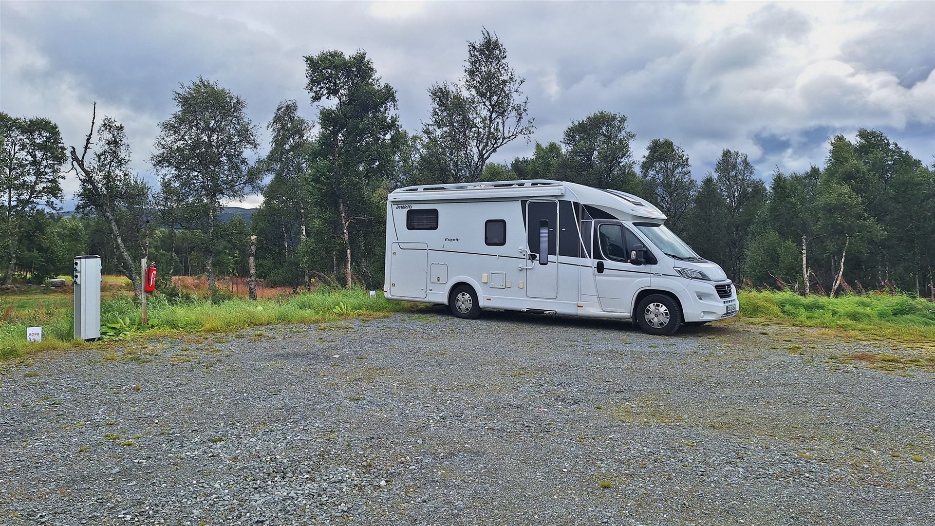 Wir fahren mehrere Runden, bis wir schließlich etwas entdecken (Link), aber auch nur, weil dort schon ein kleiner Camper steht. Keine Ausschilderung, aber Stromsäulen sind vorhanden. Also scheinen wir hier richtig zu sein ...