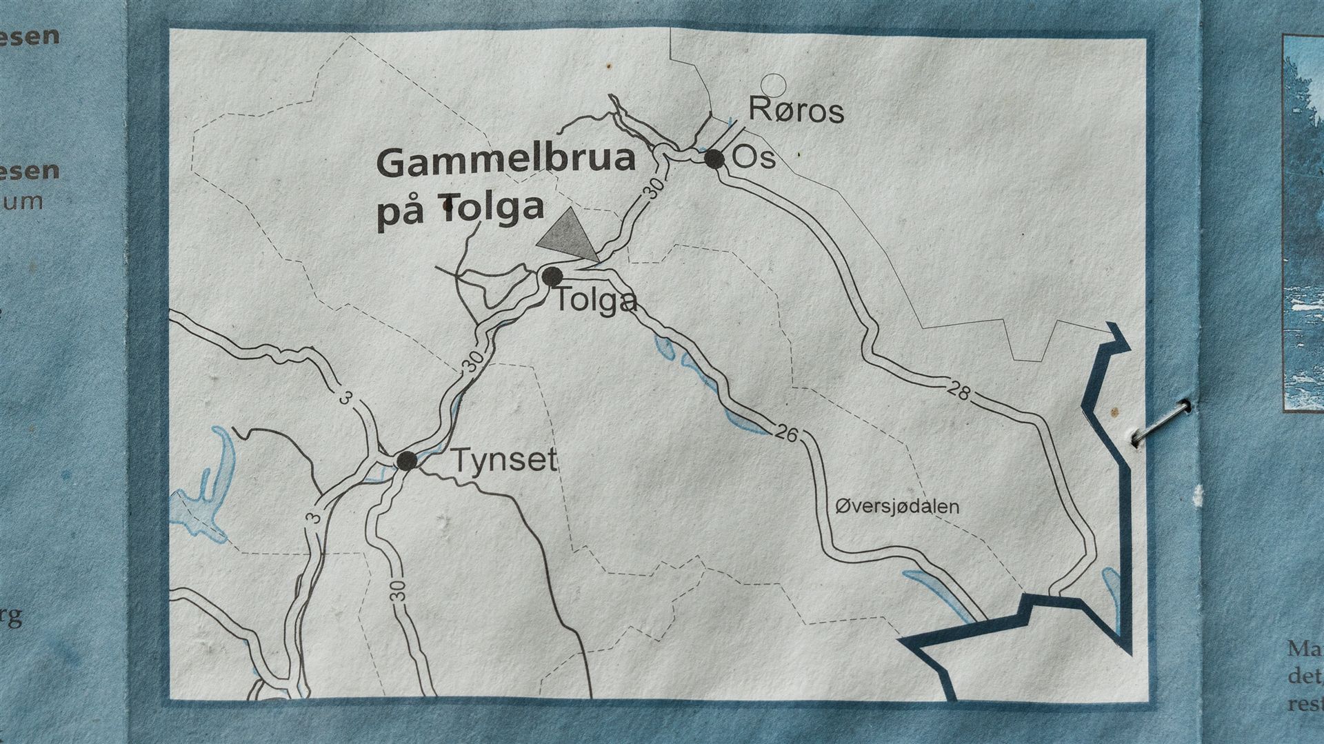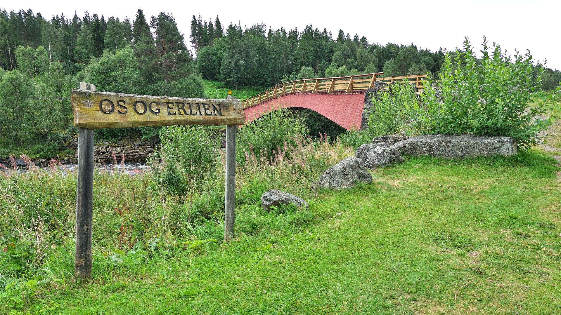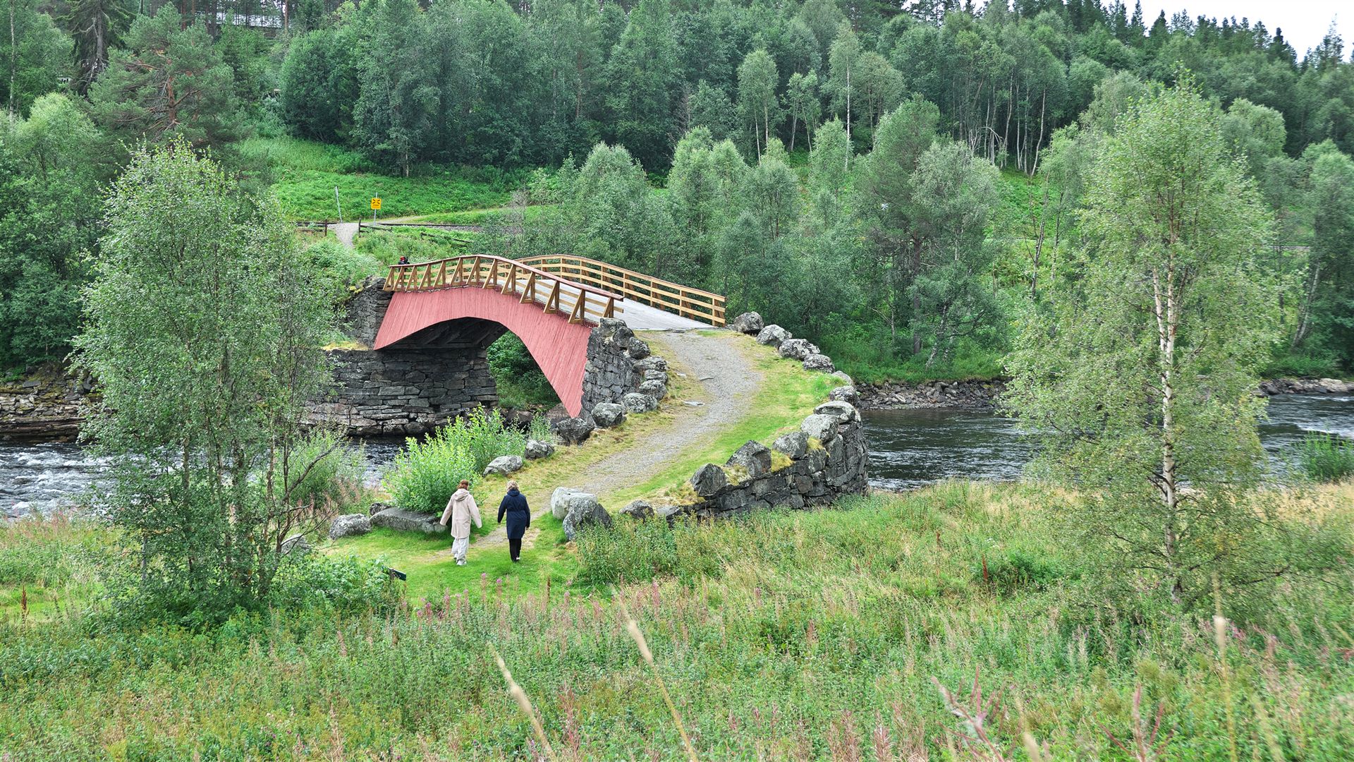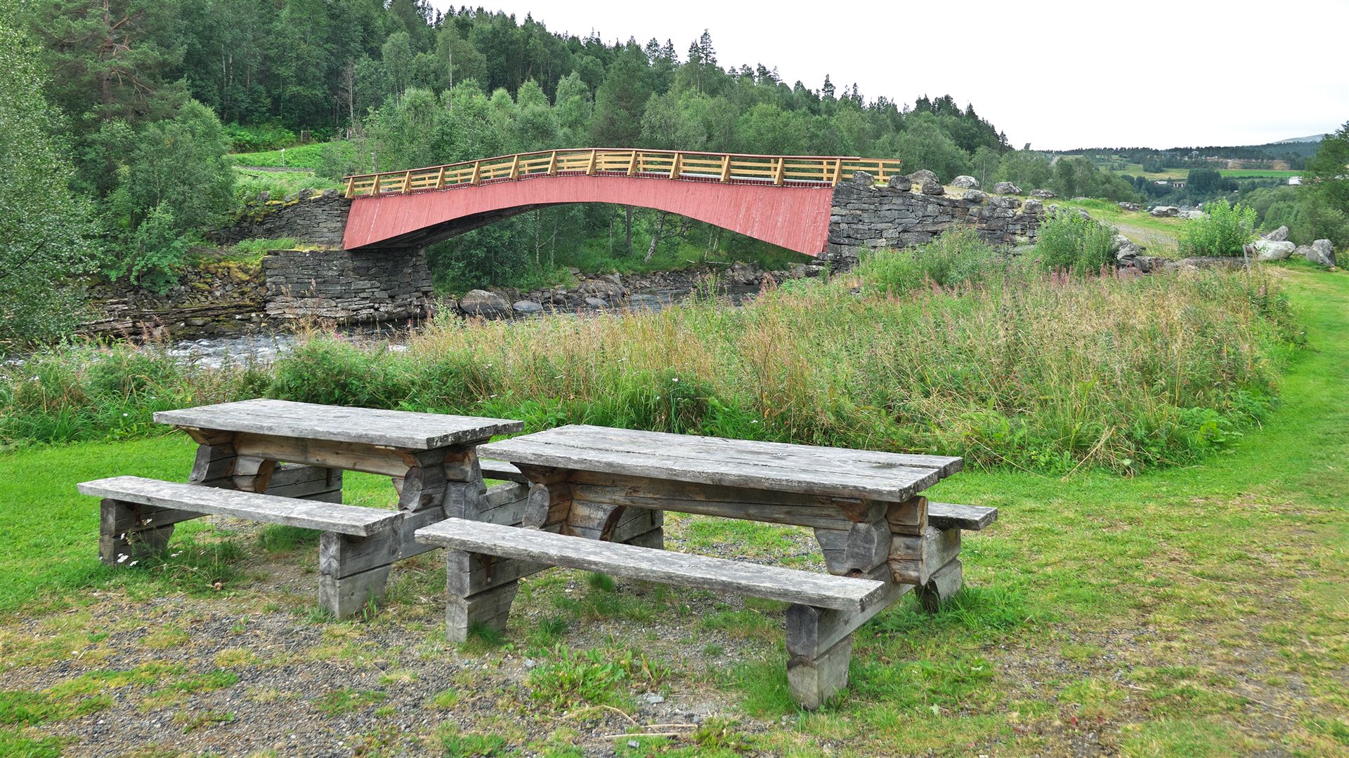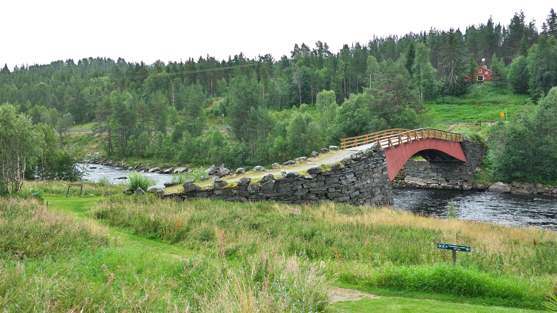 Wir fahren zur "Gammelbrua på Tolga" (Link), das ist eine alte Brücke in der Nähe vom Ort "Tolga". Sie ist ein interessantes Bauwerk. Die ursprüngliche Brücke wurde 1736 gebaut. Heute steht dort ein Wiederaufbau von 1997. Die Brücke hat eine ganz besondere Konstruktion mit einer lichten Spannweite von 32 Metern, der Größten im Lande. Sie liegt ca. 1,5 km nördlich des Zentrums an der Fv 30.