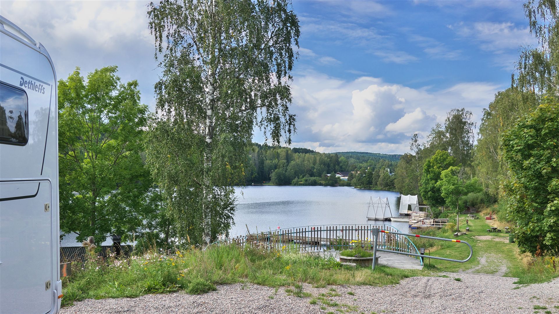 Die Fahrt nach "Dals Långed" verläuft ohne Probleme und recht entspannt. Wir können gut die dalsländische Landschaft genießen, die teilweise sehr abwechslungsreich ist. Gegen 15 Uhr erreichen wir den uns schon länger bestens bekannten Stellplatz. Dieser liegt am südlichen Ende des Sees Laxsjön etwa 15 Kilometer vom Hauptort der Gemeinde entfernt. Gegenüber der Steneby Schule im Zentrum von Dals Långed befinden sich die acht Stellplätze mit Badeplatz, Grillplatz, Frischwasser, Strom, Dusche, Toiletten und Entsorgungsmöglichkeiten. Die Einrichtungen befinden sich teilweise auf der anderen Seite der Bahngleise, jedoch nicht weiter als 50 Meter entfernt.