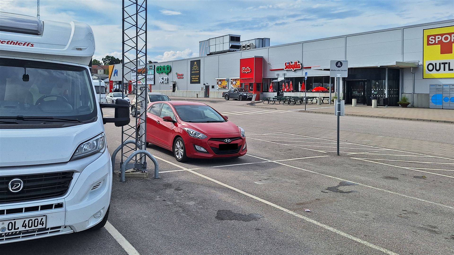 Nach der netten Unterhaltung und dem Studium der alten Maschinen kehren wir zum Wohnmobil zurück und ziehen weiter unsere Weges. So erreichen nach einigen Kilometern die Stadt "Mellerud". Da uns mittlerweile der kleine Hunger in seine Gewalt gebracht hat, halten wir beim kleinen Einkaufszentrum "Mellerud Handel" (Link) an.